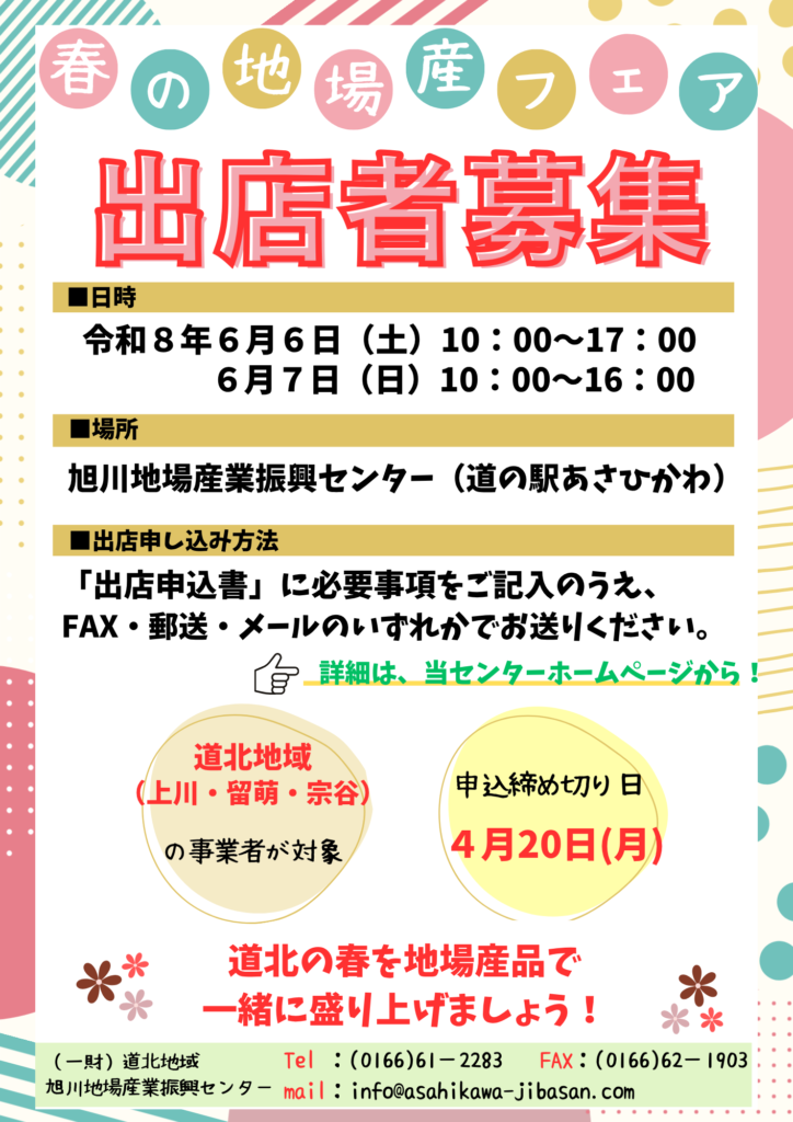 道北地域の農産物や海産物、加工食品等を地域内外に発信する「春の地場産フェア」の出店者を募集します。